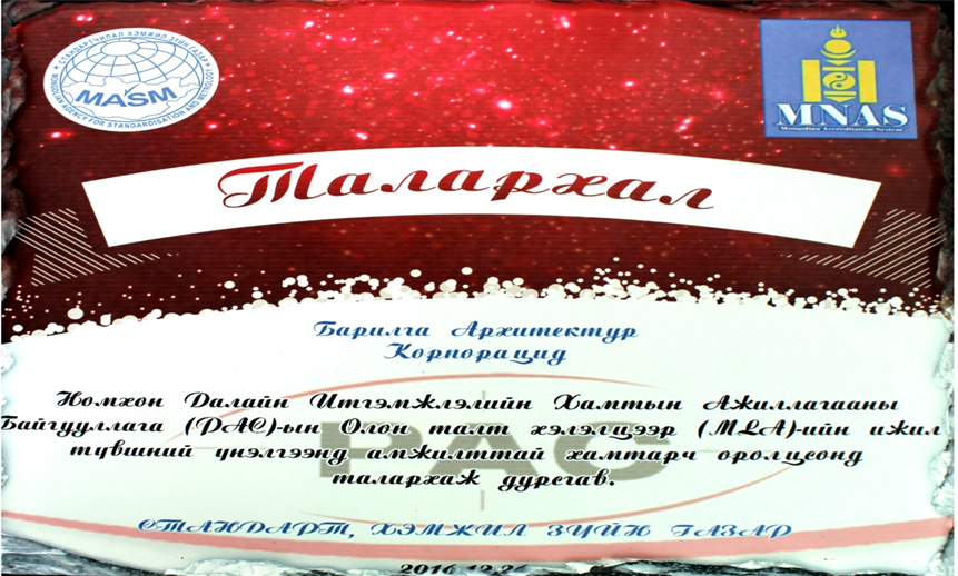 Монгол улсын Стандартчилал, хэмжил зүйн газрыг РАС-Номхон далайн итгэмжлэлийн хамтын ажиллагааны байгууллага-ын харилцан хүлээн зөвшөөрөх хэлэлцээр-т нэгдэн ороход итгэмжлэлийн үйл ажиллагааг олон улсын жишигт нийцсэнийг шалгаж нотлох зорилгоор Итгэмжлэлийн газарт 2016 оны 08 дугаар сард явуулсан үнэлгээнд Барилга архитектур корпорацийн Бүтээгдэхүүн баталгаажуулалтын алба бүтээгдэхүүний баталгаажуулалтыг хэрэгжүүлж буй чиглэлээрээ РАС-ыг төлөөлсөн Олон улсын экспертийн багийн үнэлгээнд амжилттай хамрагдсан. Үнэлгээнд амжилттай хамрагдсанаар үндэсний итгэмжлэгдсэн тохирлын үнэлгээний байгууллагуудын чадавхи зохих түвшинд хүрч, олон улсын хэмжээнд хүлээн зөвшөөрөгдөх түвшинд хүрсэнийг илтгэн харууллаа.